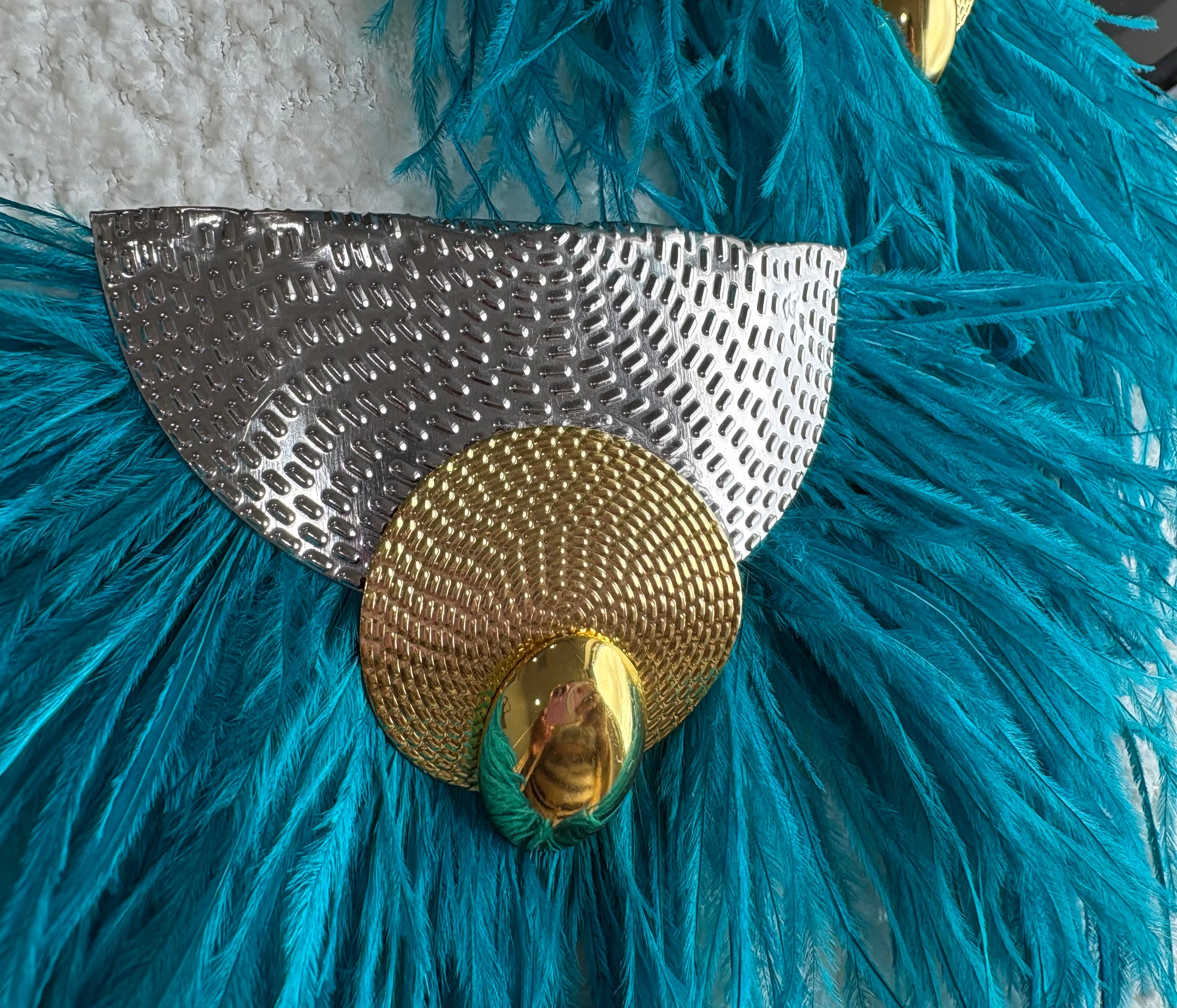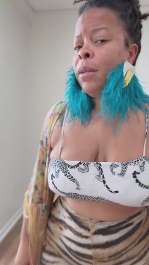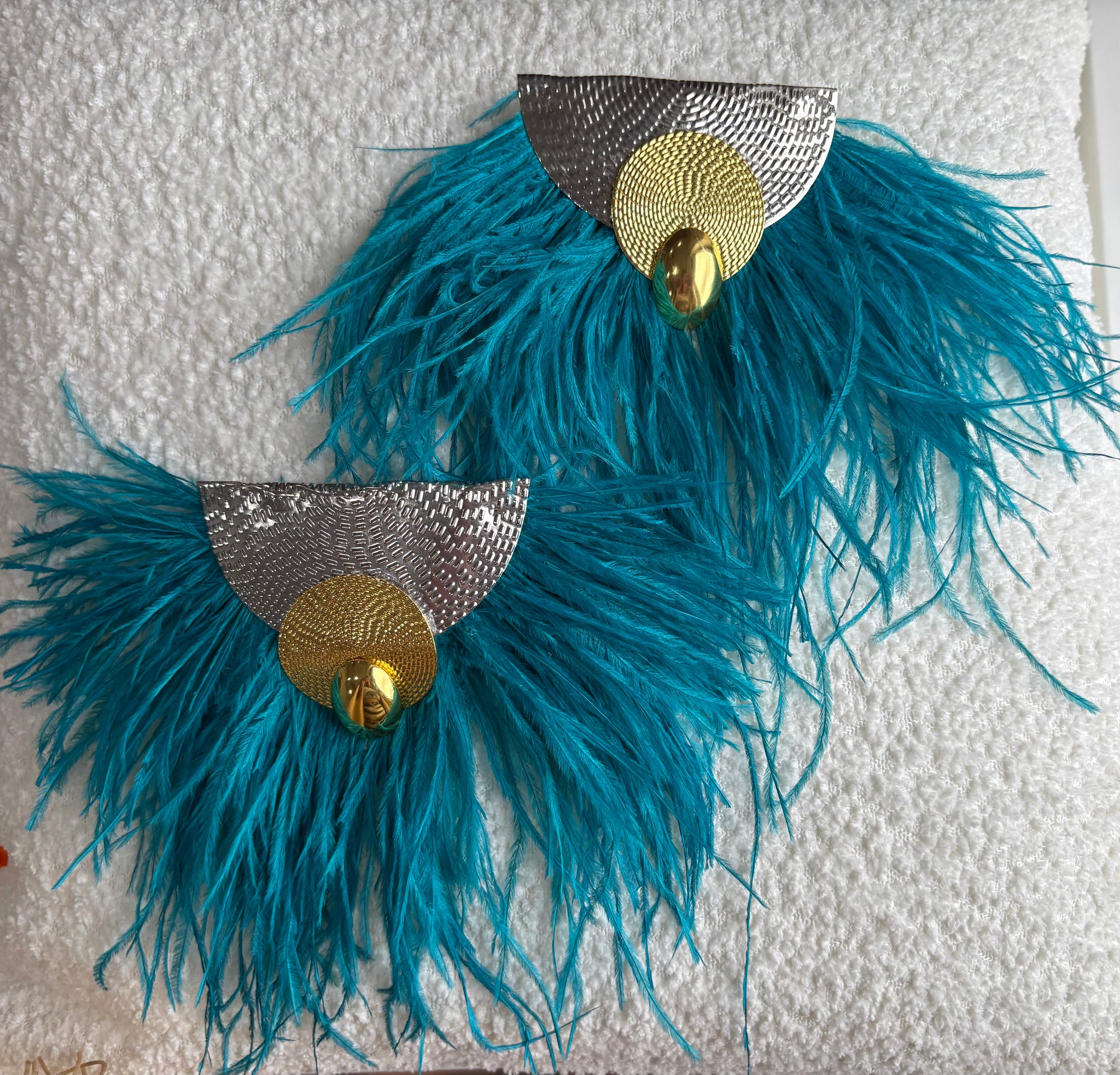 Silver and gold embellished statement earring with ostrich feathers.